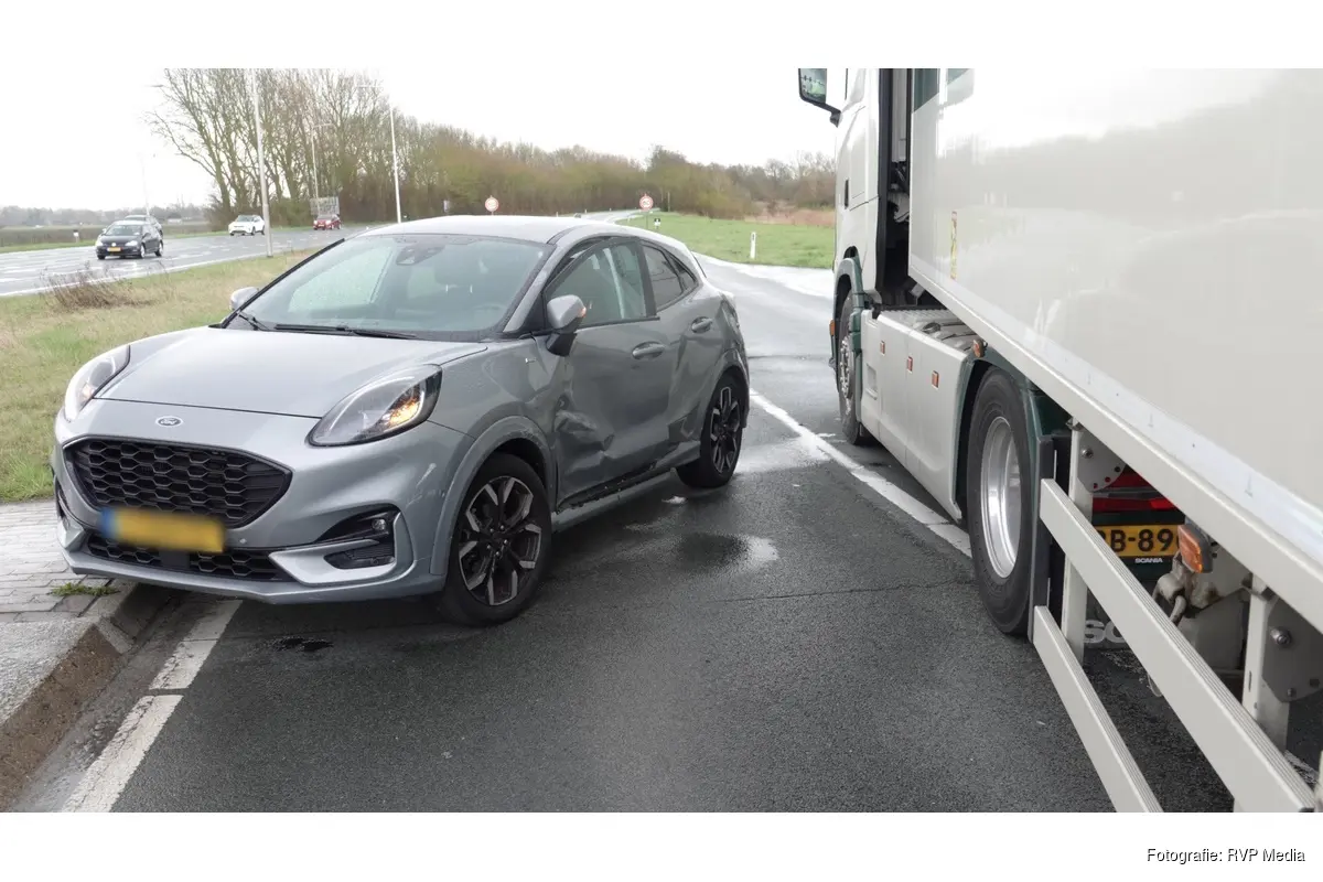 Een personenauto en een vrachtwagen kwamen door nog onbekende oorzaak met elkaar in botsing tijdens het oprijden van de N245 richting Alkmaar. De bestuurder van de personenauto is ter plaatse gecontroleerd door het ambulancepersoneel maar hoefde niet mee naar het ziekenhuis.