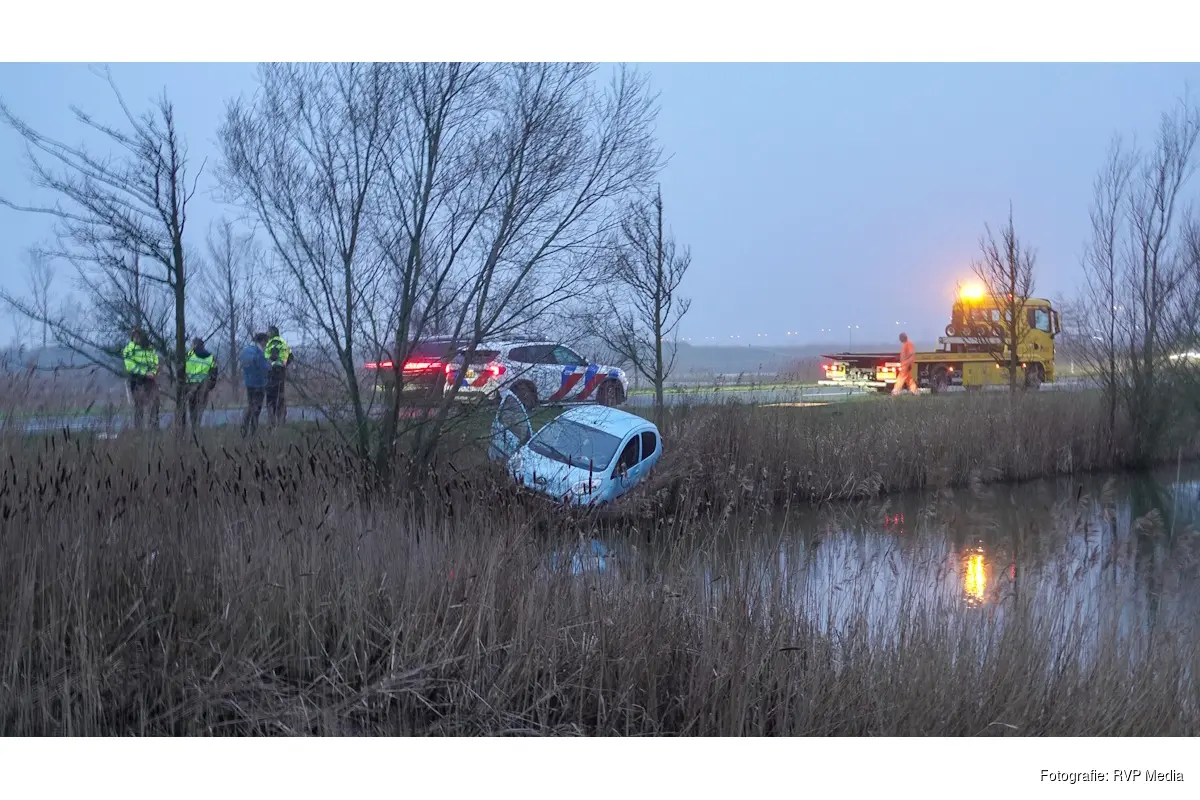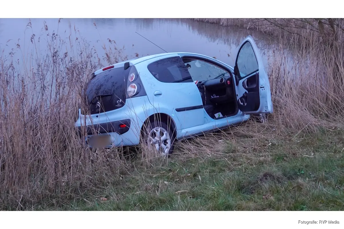 De automobilist raakte van de weg, reed een hectometerpaaltje uit de grond en kwam gedraaid in het riet tot stilstand. Wonder boven wonder belandde het voertuig niet in het water.