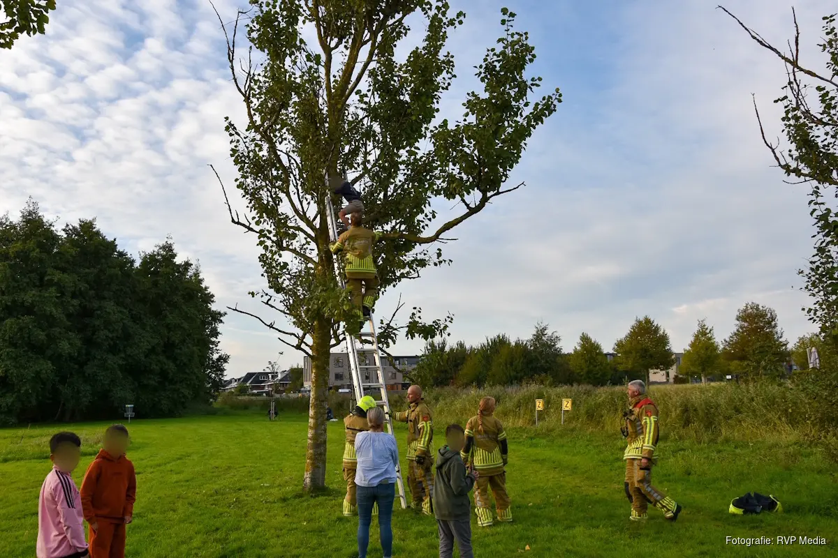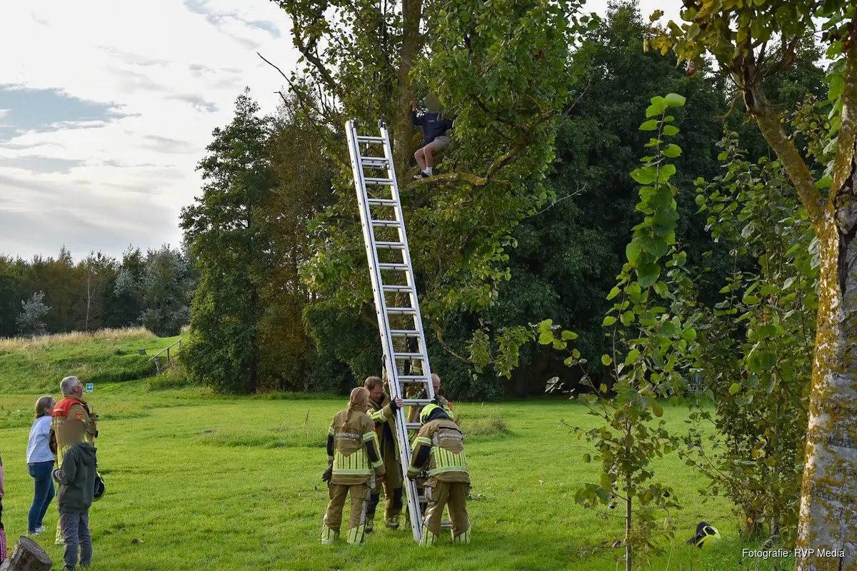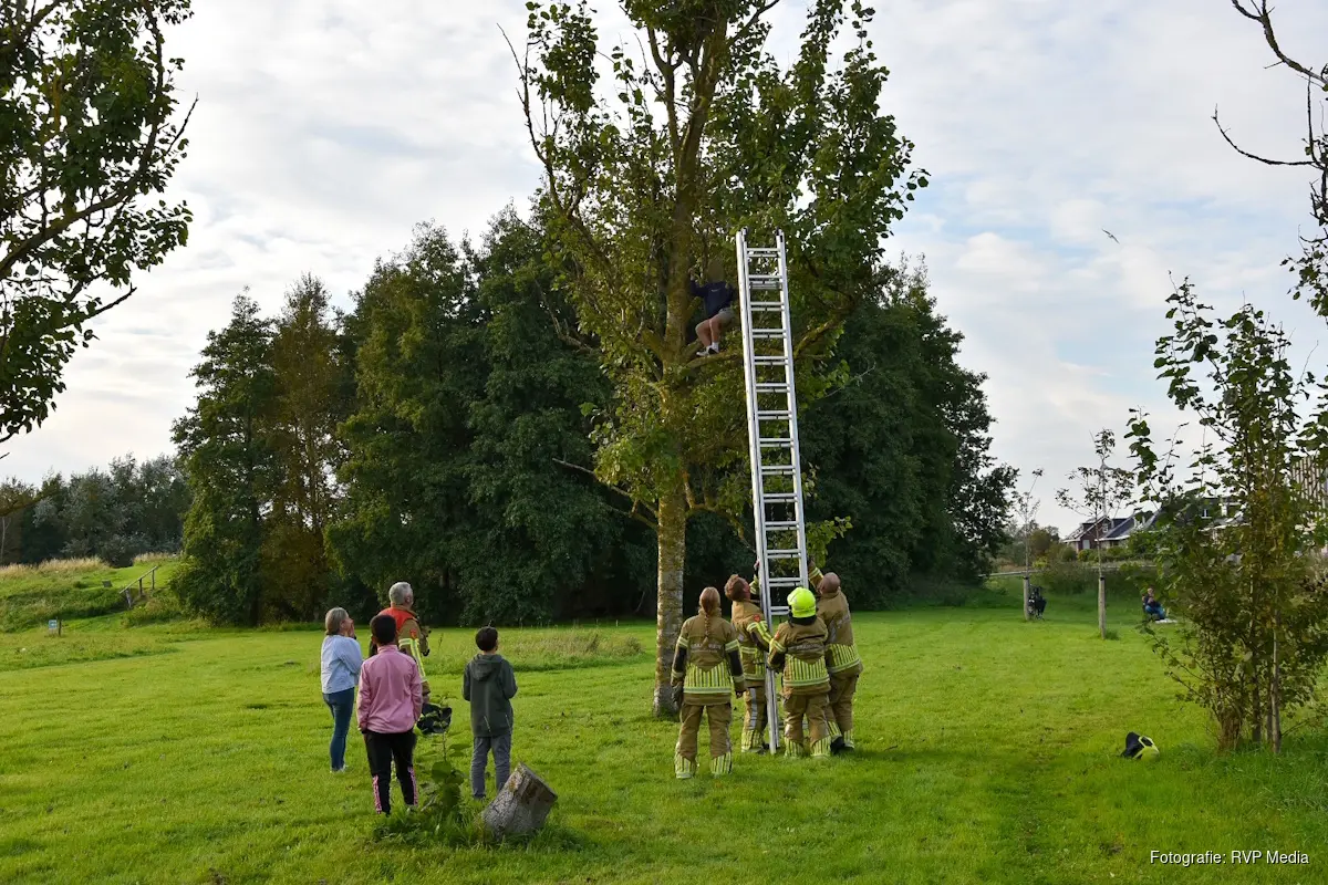 De brandweer heeft met een ladder de jongen, en de kat uit de boom weten te redden. Beide maken het goed.