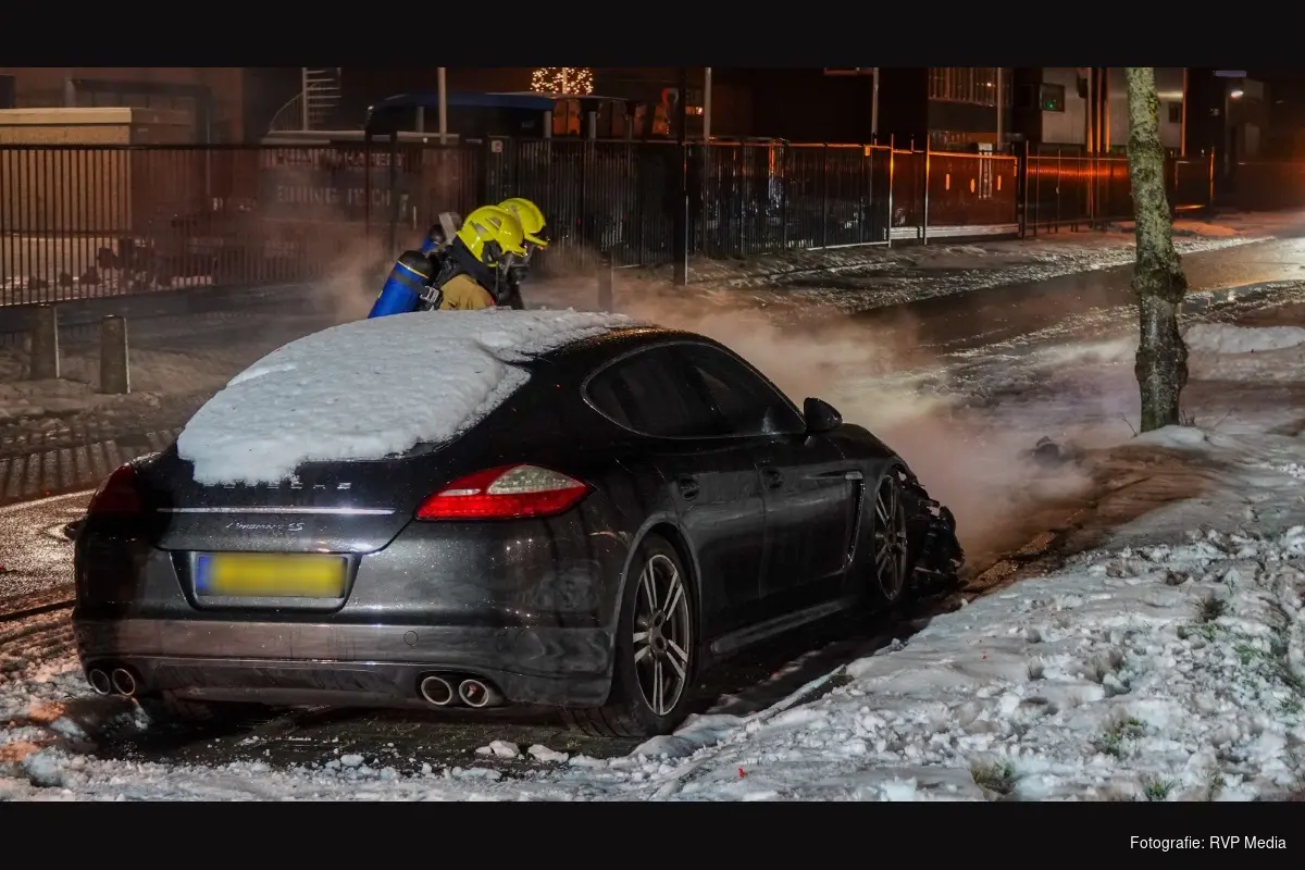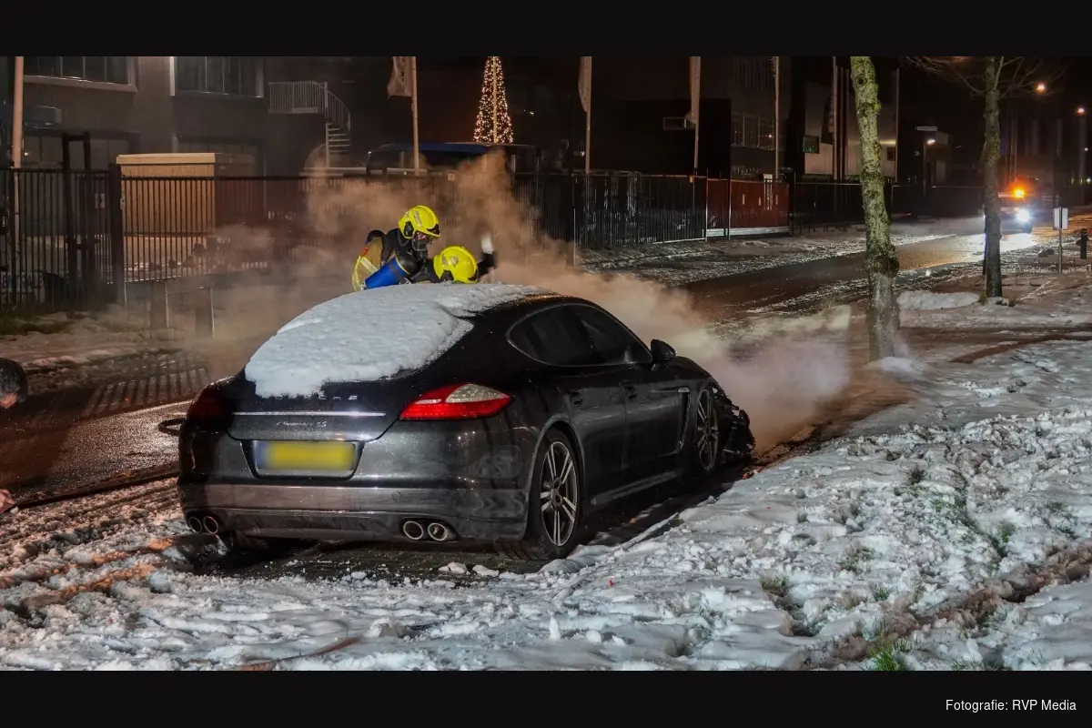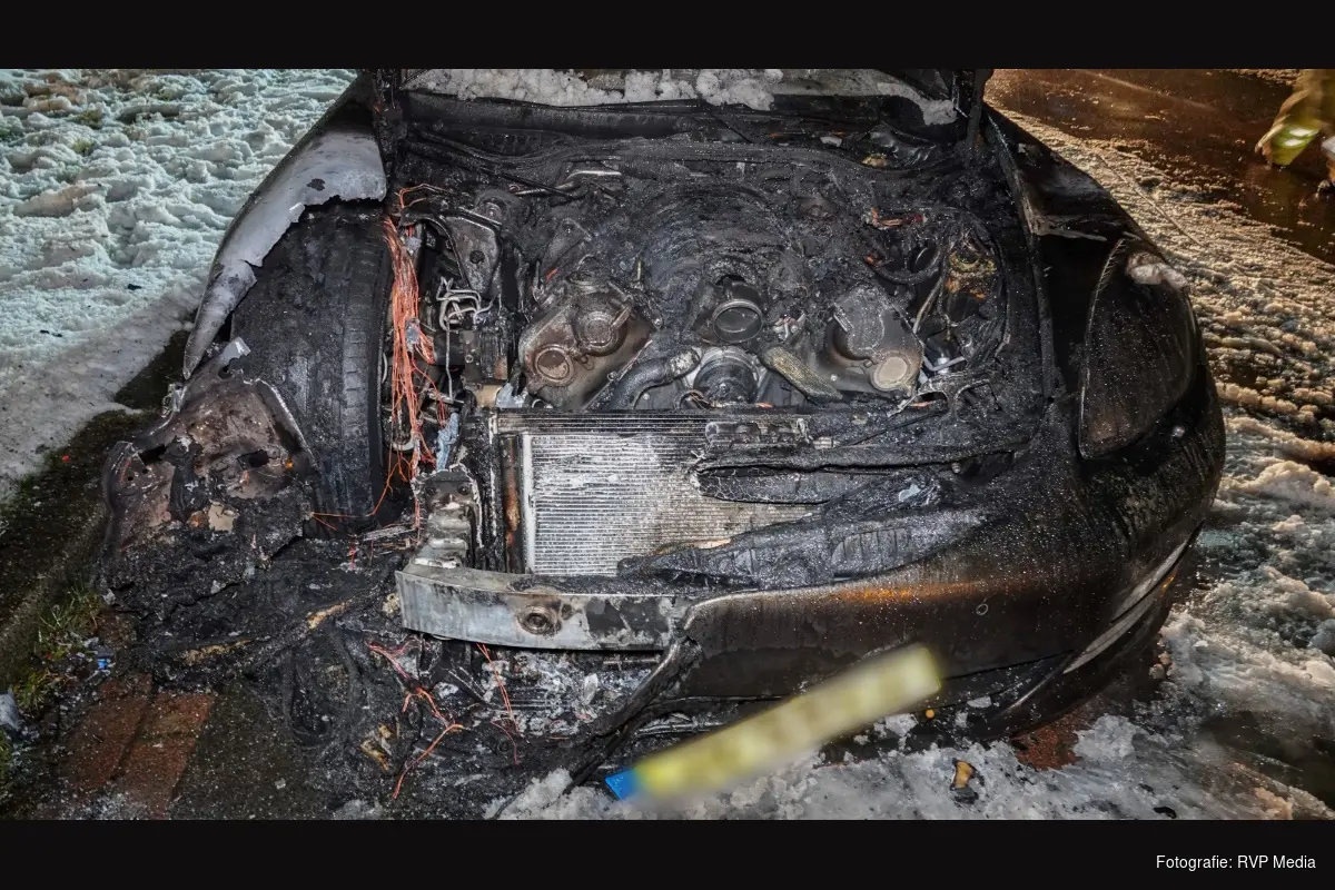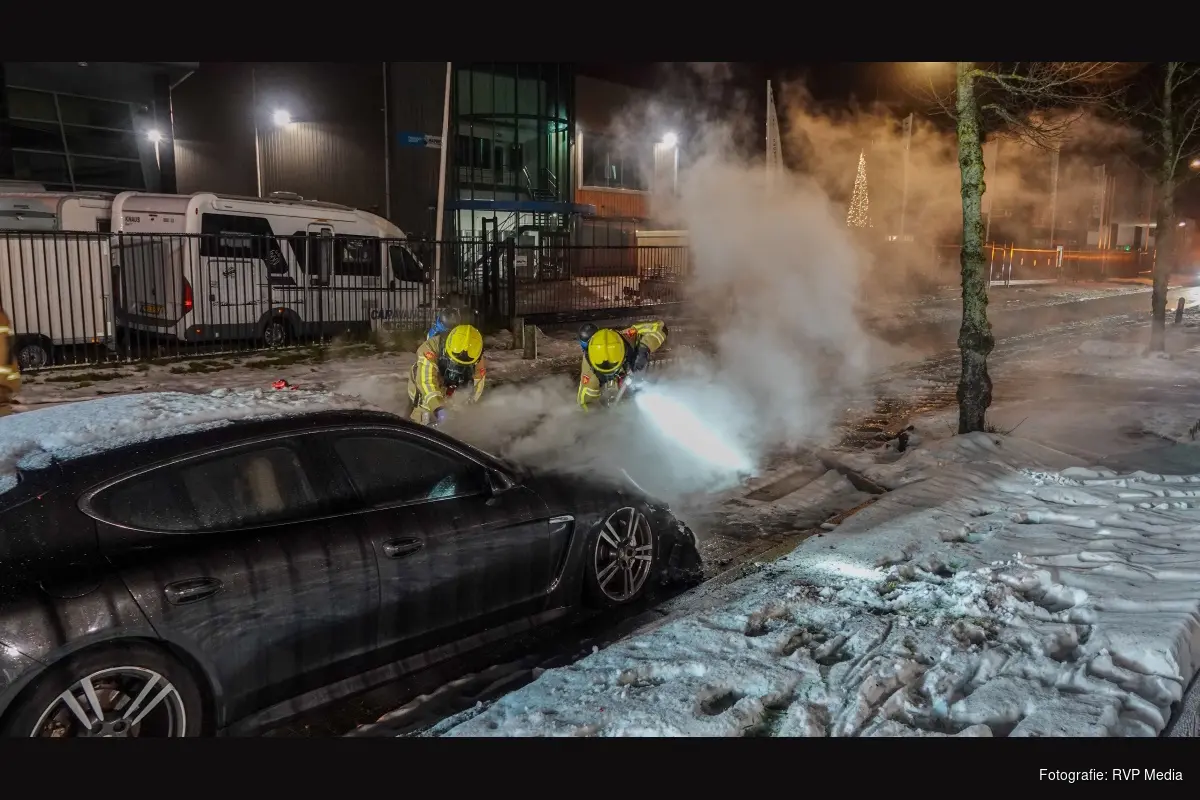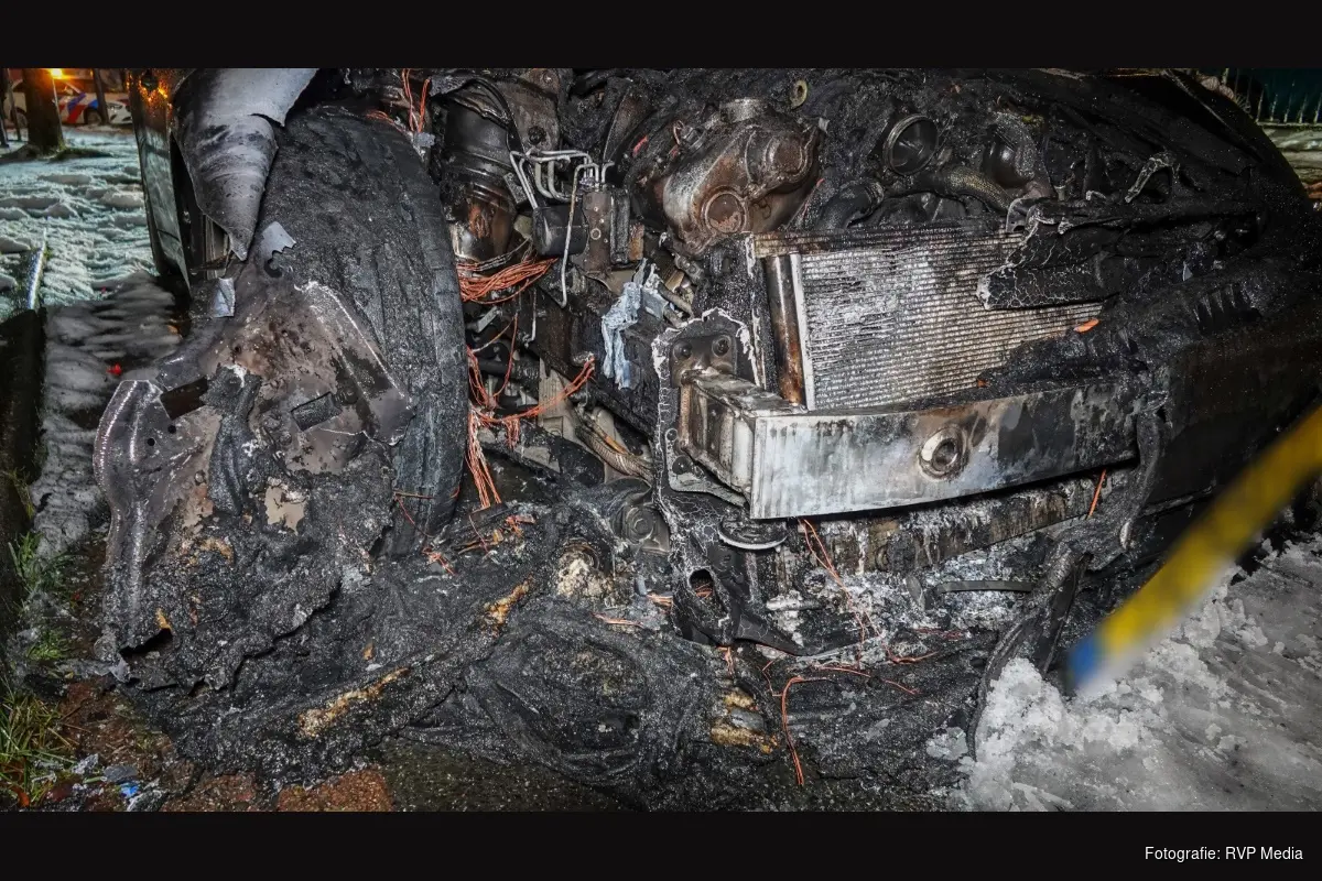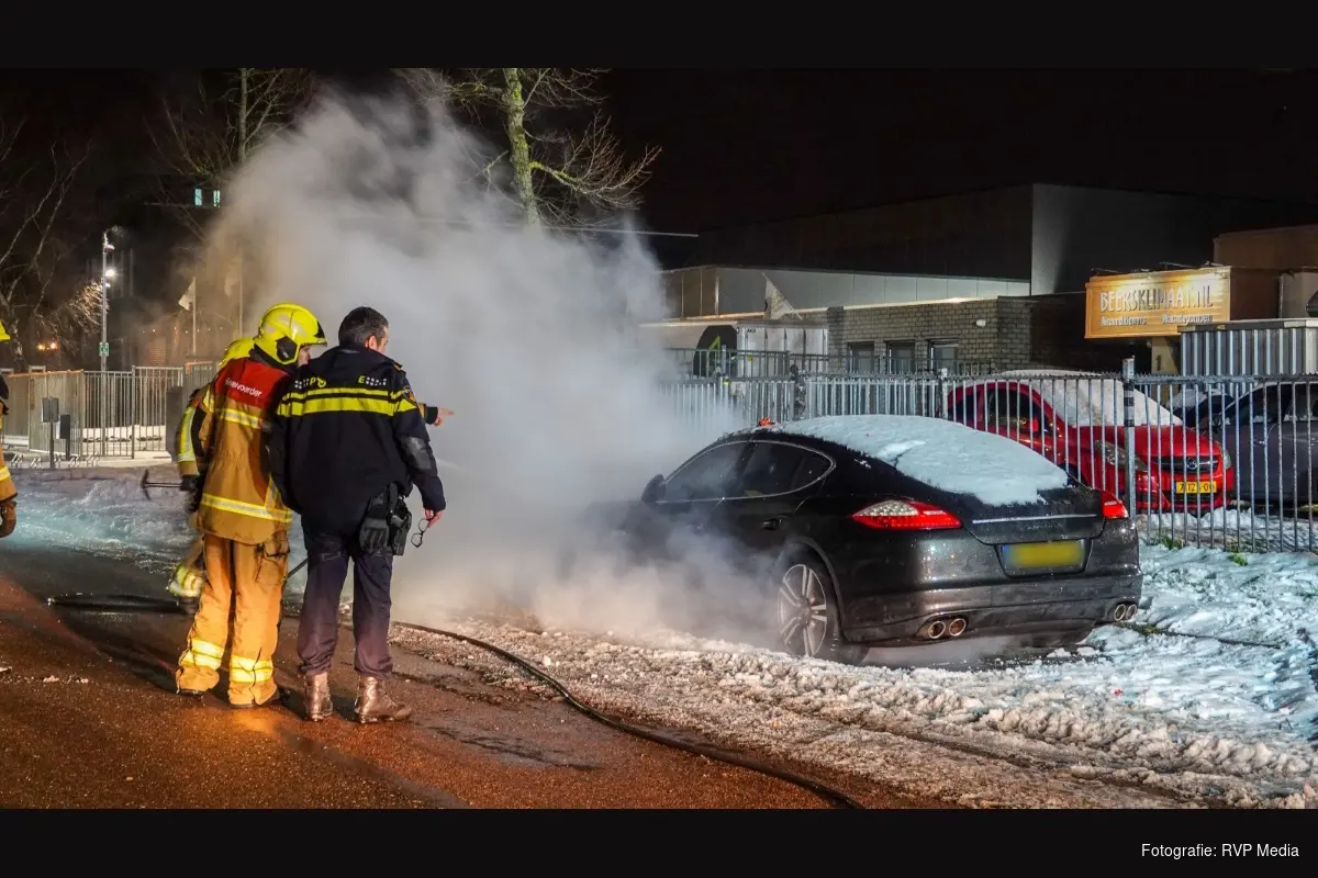 De bolide stond geparkeerd voor het hek van een autobedrijf. Ondanks de snelle inzet van de brandweer is de waardevolle auto total loss.