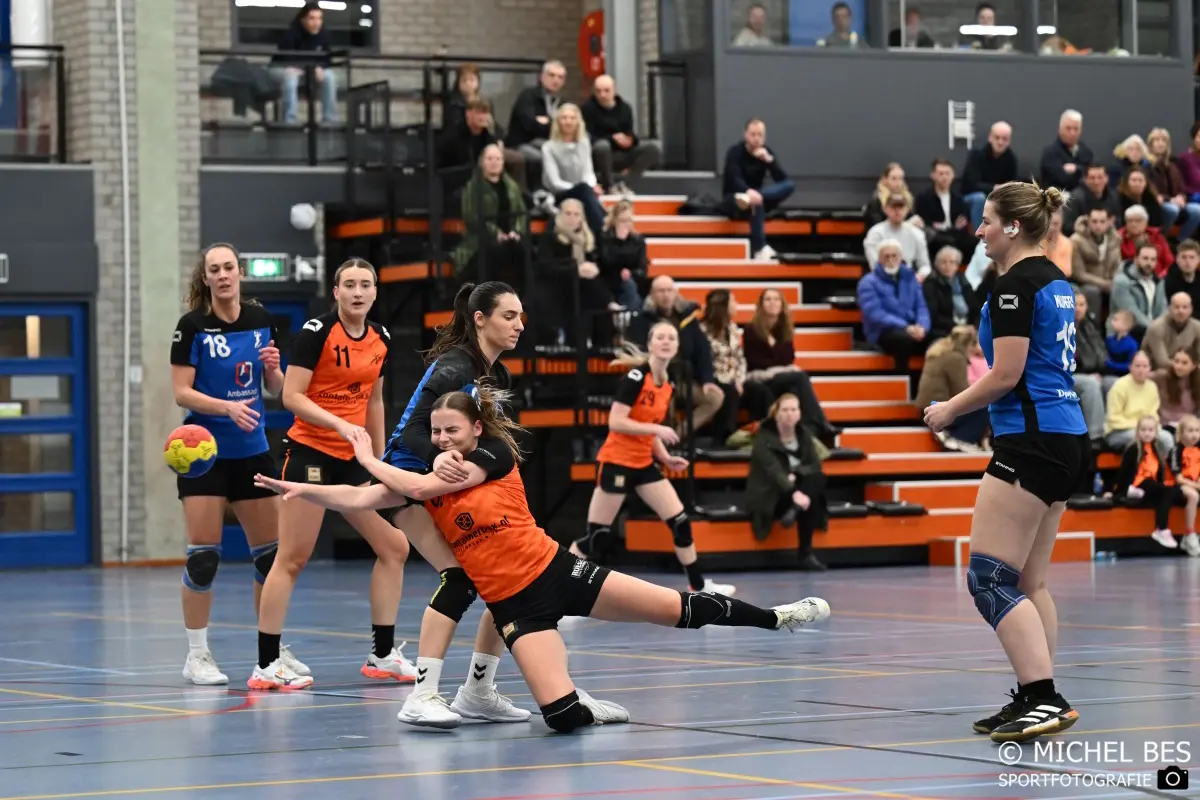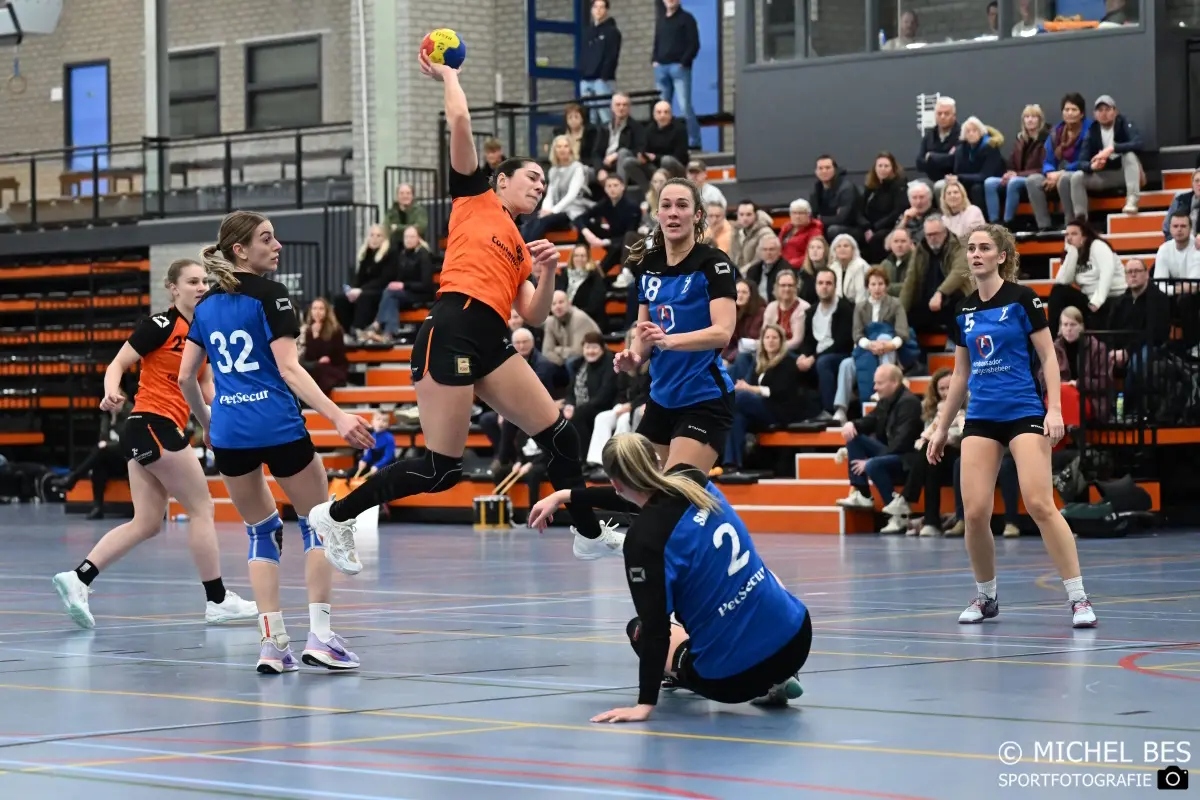 SV Zeeburg stond vooraf negende, maar liet zeker in de eerste helft geregeld zien dat het een moeilijk te bestrijden tegenstander is. KSV, dat aantrad zonder de ervaring van aanvoerster Jacqueline Köhne en Jonna Lemstra, had het dan ook bijzonder lastig. De thuisploeg nam al snel een 3-0 voorsprong, maar Zeeburg kwam sterk terug en hield vervolgens tot 8-8 gelijke tred. Daarna kwam een periode waarin KSV afstand leek te nemen, mede door vijf benutte strafworpen van Romy Brink. Na 15-9 toonden de gasten uit Diemen echter de nodige veerkracht, kwam terug tot 16-16, drukte door, en ging zelfs met een 17-19 voorsprong rusten.