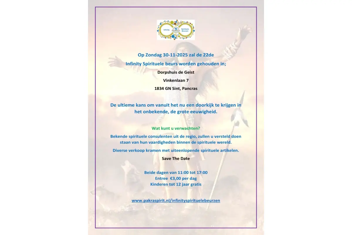 Op zondag 30-11-2025 zal de 22e Infinity Spirituele beurs worden gehouden in De Geist Vinkenlaan 7 1834 GN, Sint Pancras De ultieme kans om vanuit het nu een doorkijk te krijgen in het onbekende, de grote eeuwigheid.