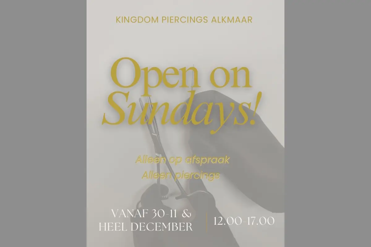 Vanaf 30 november zal Kingdom Piercing Alkmaar elke zondagmiddag tussen 12.00 uur en 17.00 uur geopend zijn voor het zetten van piercings. De professionele piercers van Kingdom Alkmaar nemen dan ook op zondag écht de tijd voor je.