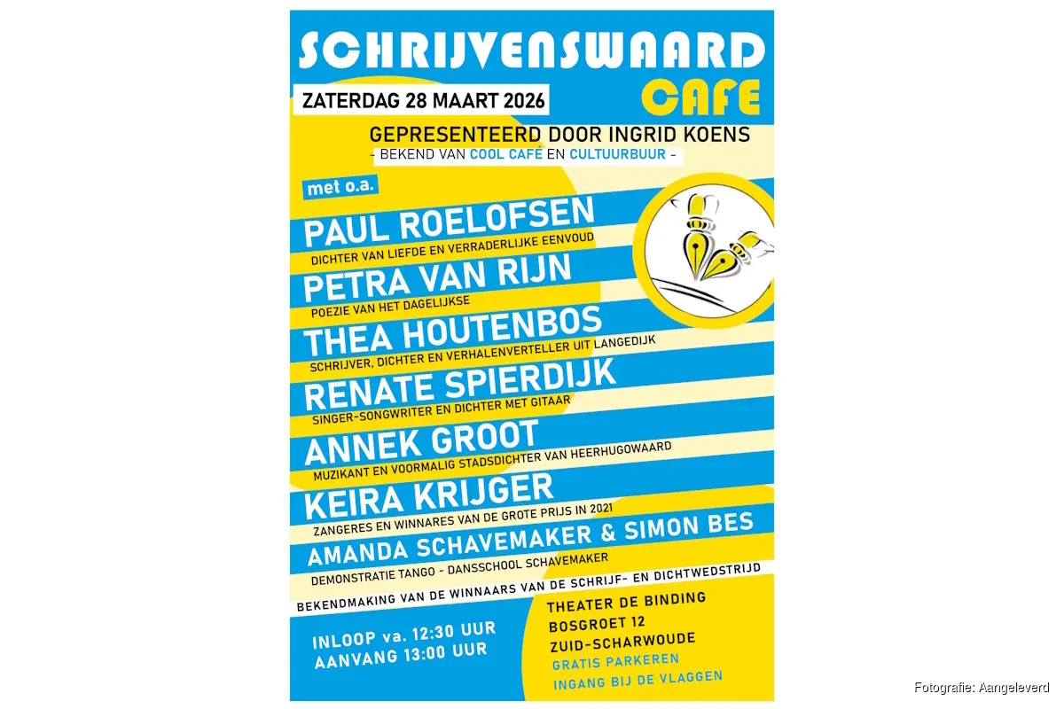 ZUID SCHARWOUDE - Op zaterdag 28 maart nodigt Schrijvenswaard in “De Binding” in Zuid-Scharwoude u uit in het Schrijvenswaard Café. Saskia Engelhart maakt samen met John Does (Wethouder van Cultuur in Dijk en Waard) de winnaars bekend van de gedichten- en verhalenwedstrijd.