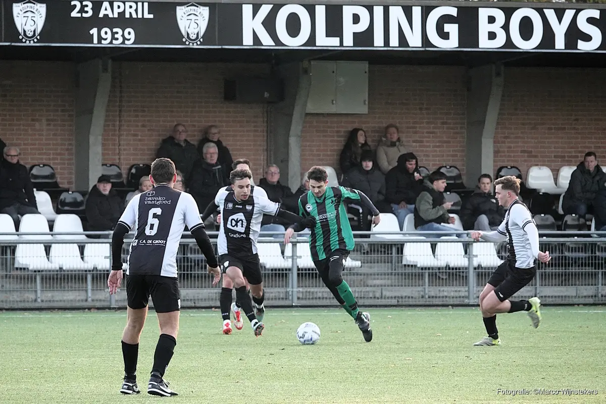Vrone van trainer Marco Webeling, die het mocht opnemen tegen de ploeg waar hij vorig seizoen nog aan het roer stond, had op de ranglijst een hogere positie, maar had het lastig tegen het goed georganiserend spelende Kolping Boys alwaar Niels de Wit een glansrol zou vervullen. De aanvaller van Kolping Boys opende vlak voor rust de score en wist die na de pauze te verdubbelen. Een tweede gele kaart voor Koen Plomper bracht de Oudorpers niet van hun stuk en De Wit al helemaal niet, want die tekende vlak voor tijd voor zijn derde goal en gooide het duel in het slot. Namens Vrone mocht Dennis Konijn nog wel een eretreffer maken.