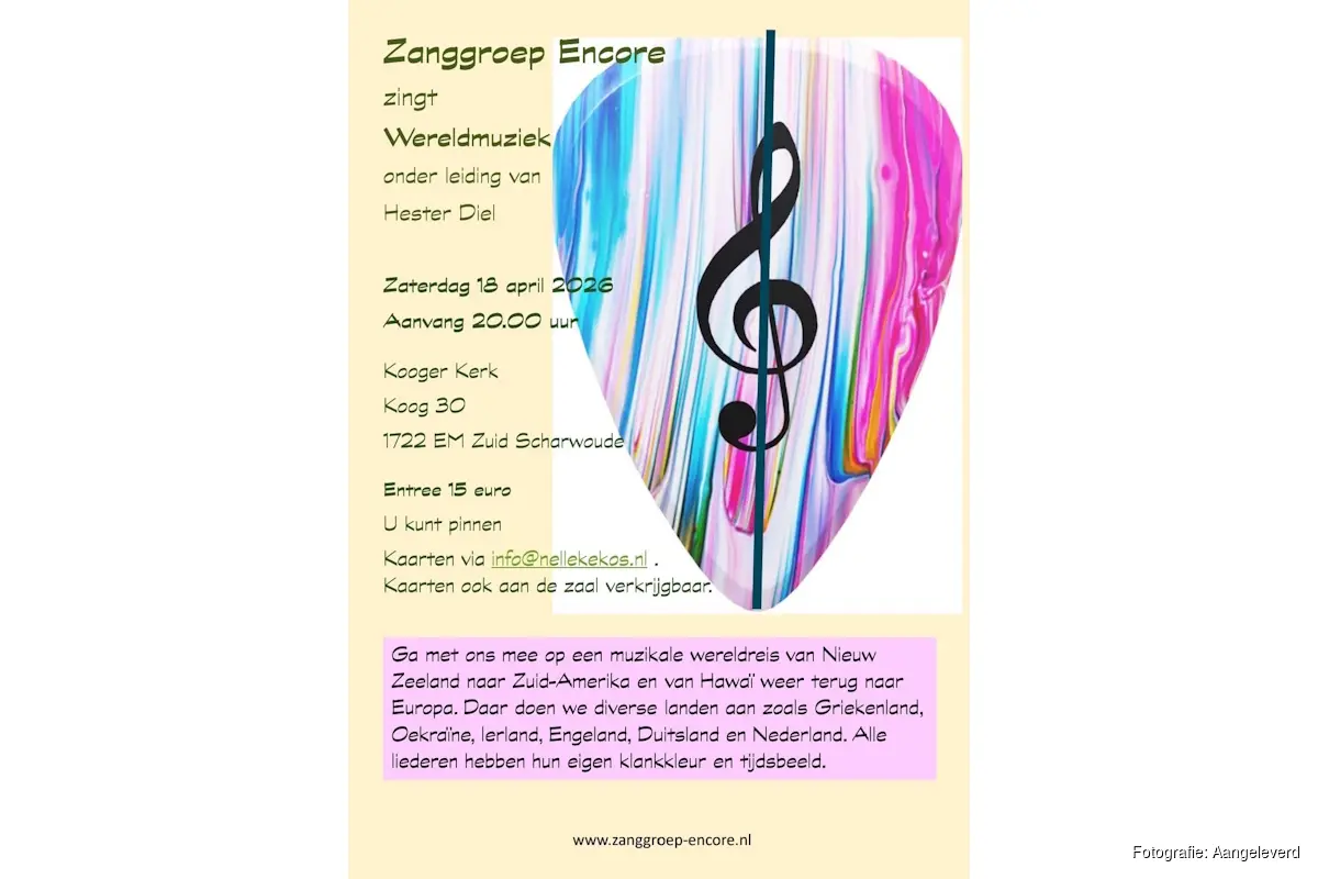 ZUID-SCHARWOUDE - Zanggroep Encore treedt op in de Kooger Kerk in Zuid-Scharwoude op 18 april 2026 om 20.00 uur, entree 15—euro.