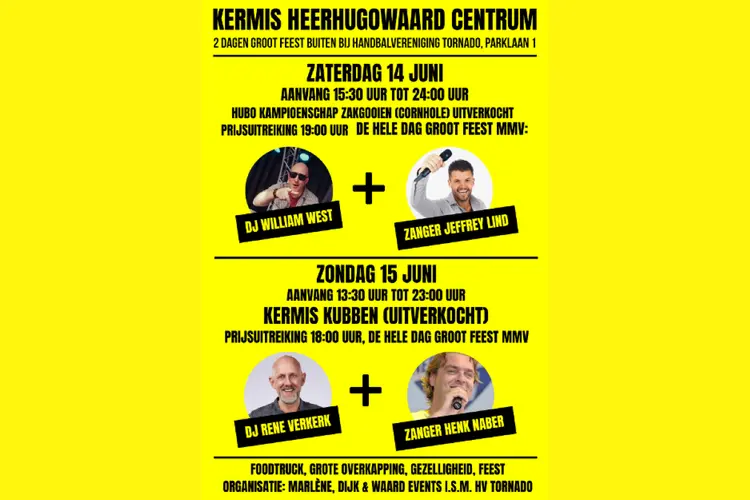 Ondanks dat Uitgaanscentrum Marlene verkocht is aan Fietsvoordeelshop organiseert Ad Molenaar met Hans Groenland (Marlène & Dijk en Waard Events) i.s.m HV Tornado dit jaar zelfs 2 dagen KERMIS-FEEST bij Handbalvereniging Tornado op de Parklaan 1 in Heerhugowaard tegenover SVW 27. Dit jaar is er een overkapping, voldoende gratis toiletten en zijn er weer foodtrucks en heel veel gezelligheid.