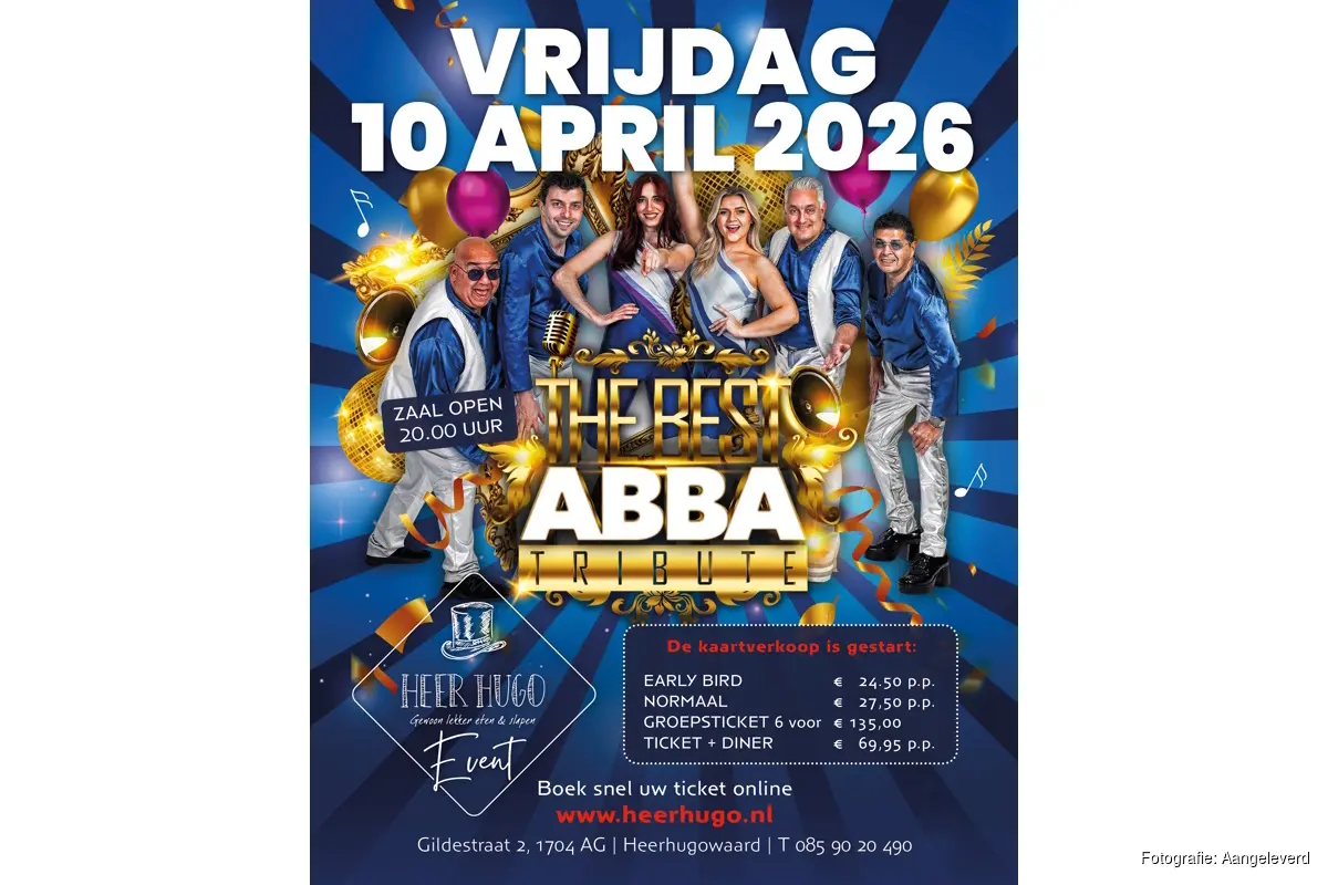 HEERHUGOWAARD - Wie houdt er niet van ABBA? Op vrijdagavond 10 april brengt The Best ABBA Tribute een sprankelend eerbetoon aan de legendarische Zweedse popgroep. Met zes ervaren muzikanten, meerstemmige zang, authentieke jaren '70- en '80-outfits en professionele licht- en geluidstechniek wordt de karakteristieke ABBA-sound indrukwekkend tot leven gewekt.